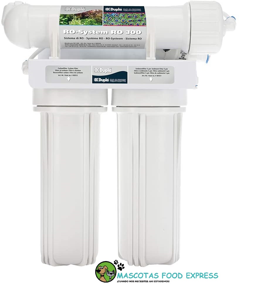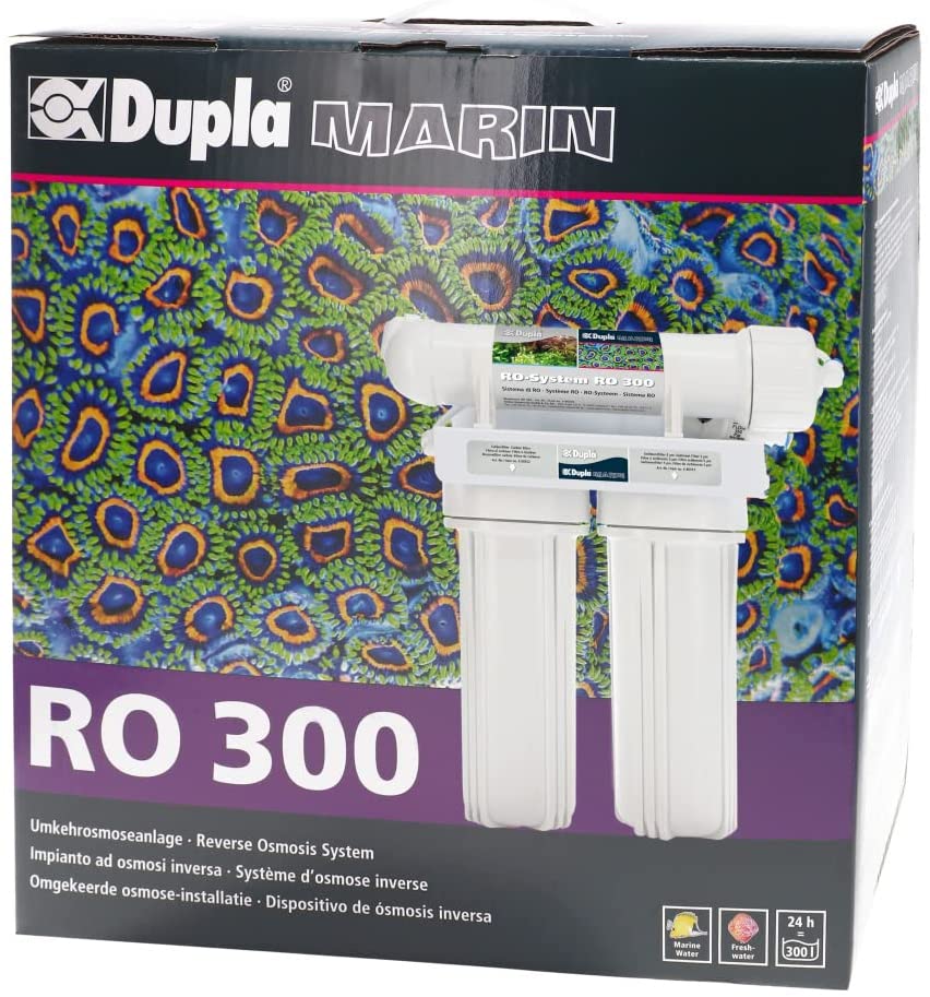 El sistema de ósmosis inversa Dupla RO 300 está completamente premontado y crea una fuente de agua óptima para acuarios de agua dulce y salada. El agua del grifo no siempre es adecuada para acuarios y, por lo tanto, debe tratarse con un sistema de ósmosis inversa que extrae minerales y sales del agua del grifo. Los sistemas de ósmosis inversa crean una fuente óptima de agua para acuarios de agua dulce y salada. A menudo, muchos problemas de agua solo se pueden resolver mediante el uso de agua de ósmosis. Los sistemas de ósmosis inversa trabajan en el principio de filtrado físico. A diferencia de los intercambiadores de iones, por ejemplo, que intercambian iones formadores de dureza (por ejemplo, calcio) para otros iones de formación de no dureza (por ejemplo, sodio), contaminantes (por ejemplo, silicato y nitrato) y formadores de dureza se eliminan físicamente del agua en la ósmosis inversa. En un sistema de ósmosis inversa, el agua se extiende a través de la presión de 2-6 bar en tuberías de agua domésticas comunes a través de una membrana semipermeable.