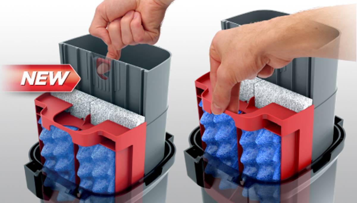 + cartucho de prefiltro vertical único con acceso independiente proporciona más superficie y mejor filtración mecánica.