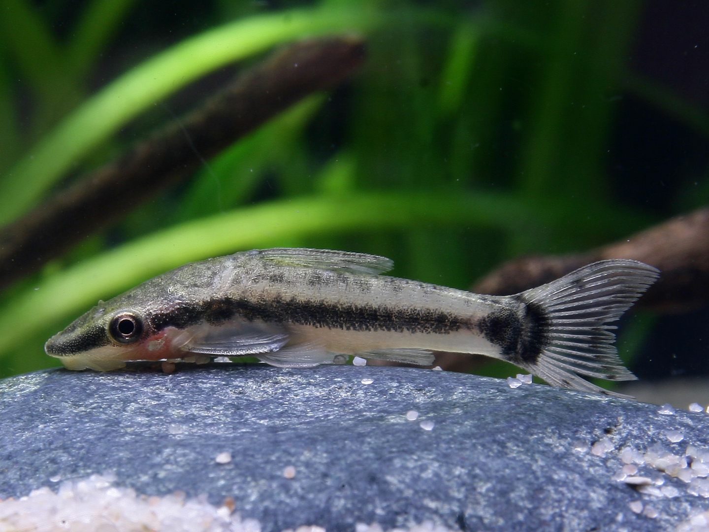 Su comportamiento en acuario es pacífico y podemos observarlos realizando desplazamientos cortos entre periodos de reposo sobre cualquier objeto sumergido incluyendo los cristales sujeto con su aparato bucal succionador.