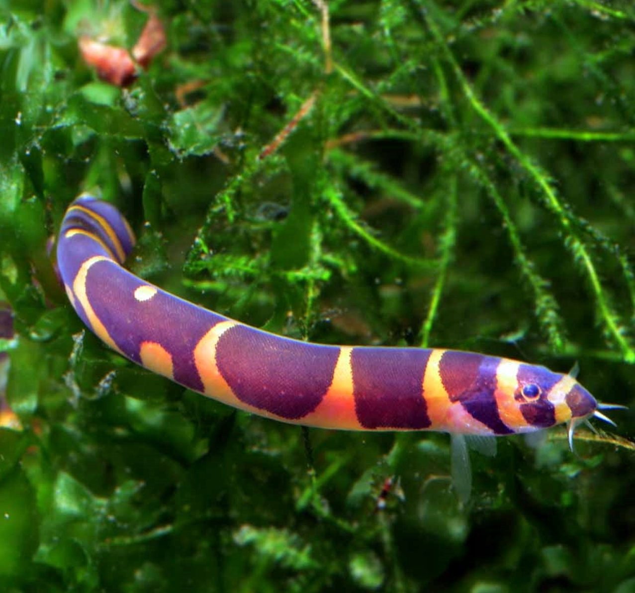 Si observas este pez, a primera vista, seguramente te va a parecer una serpiente, ya que es un pez muy alargado (puede llegar a medir hasta 15 centímetros de longitud), con aletas muy pequeñas, casi imperceptibles, y con una cabeza en forma de cabeza de serpiente (redondeada). De otro lado, su cuerpo es oscuro y esta recorrido por unas bandas de color negro , anaranjado o amarillo, que cubren su cuerpo.
